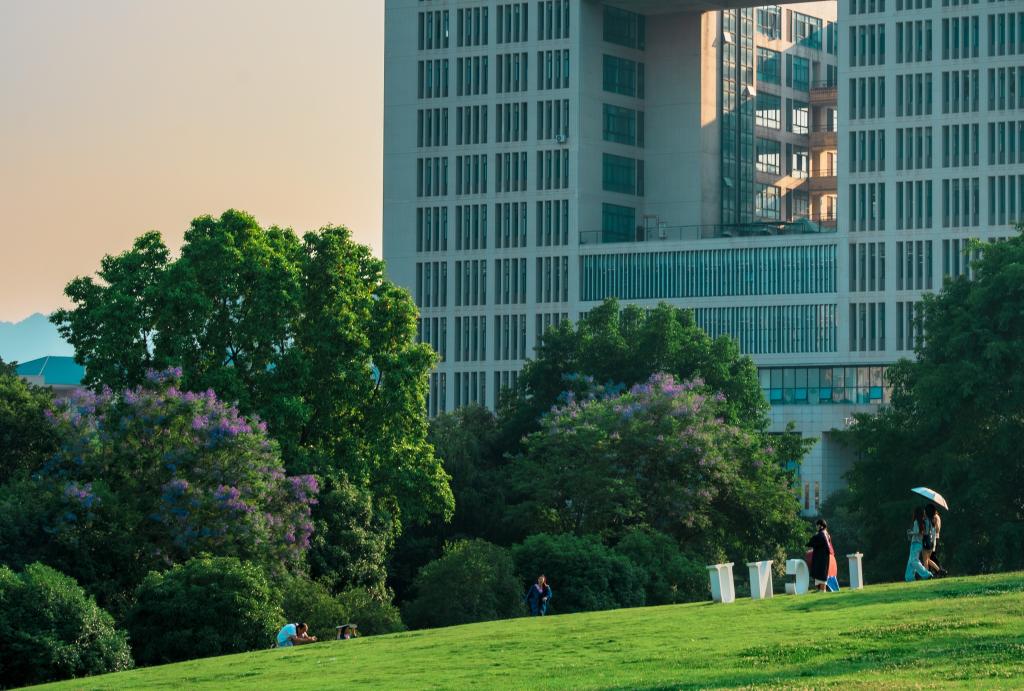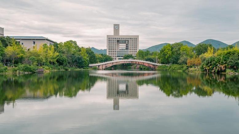 镜湖钟楼映山青