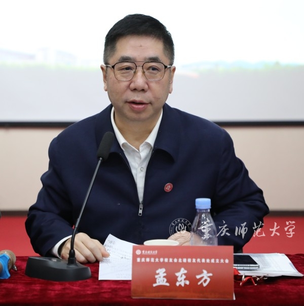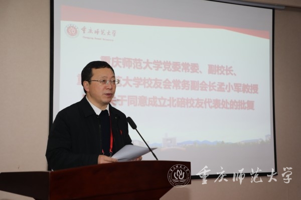 孟东方代表学校对北碚校友代表处成立表示祝贺,向一直关心学校改革发展的校友们表示衷心感谢。他谈到,校友是学校的宝贵资源和财富,是联系学校与社会的重要桥梁,是学校发展的重要力量和最可靠的资源,是母校行走的明信片;凝聚校友、支持校友、成就校友的发展,始终是母校校友工作永恒的主题。他对北碚校友寄予三点希望,一是弘扬重师精神,共庆母校华诞;二是践行责任担当,助推地方发展;三是增进交流合作,共谱和美乐章。他强调,有广大校友的关心与大力支持,重师校友工作一定会更上一层楼,母校这棵大树一定会更加枝繁叶茂。