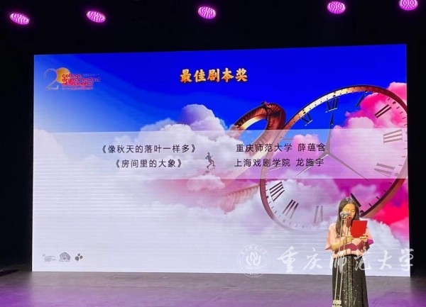 6月17日,由上海市文学艺术界联合会、上海市学生联合会、上海市戏剧家协会联合主办,上海话剧艺术中心承办的第二十届上海市大学生话剧节在上海落下帷幕,经过两周的激烈角逐,米乐官网文学院2020级戏剧影视文学专业学生薛蕴含创作的剧本作品《像秋天的落叶一样多》获得剧本创作组“最佳剧本奖”。