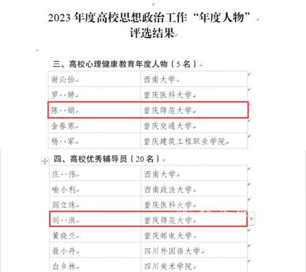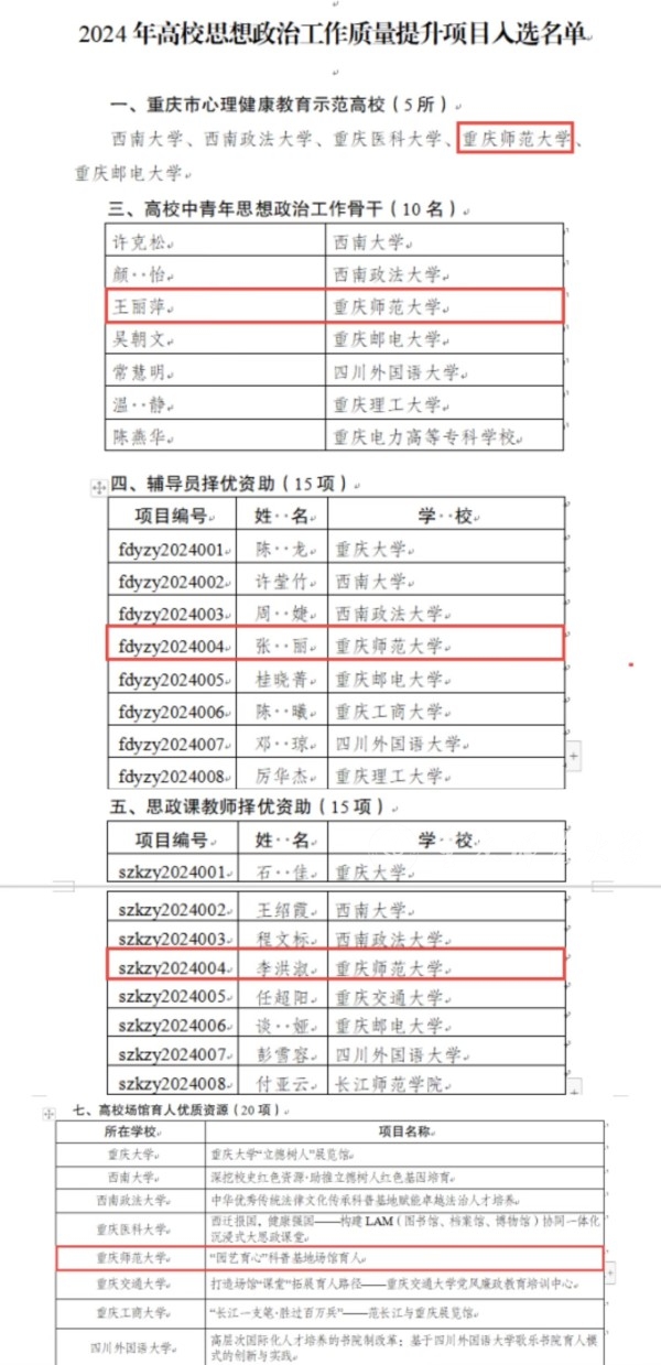 近日,重庆市委教育工委、市教委公布了2024年高校思想政治工作质量提升项目名单和2023年度高校思想政治工作“年度人物”评选结果,米乐官网入选“重庆市心理健康教育示范高校”,王丽萍入选“高校中青年思想政治工作骨干”,张丽入选“辅导员择优资助项目”,李洪淑入选“思政课教师择优资助项目”,“园艺育心”科普基地场馆育人入选“高校场馆育人优质资源”;陈娟入选“高校心理健康教育年度人物”,刘洪入选“高校优秀辅导员”。