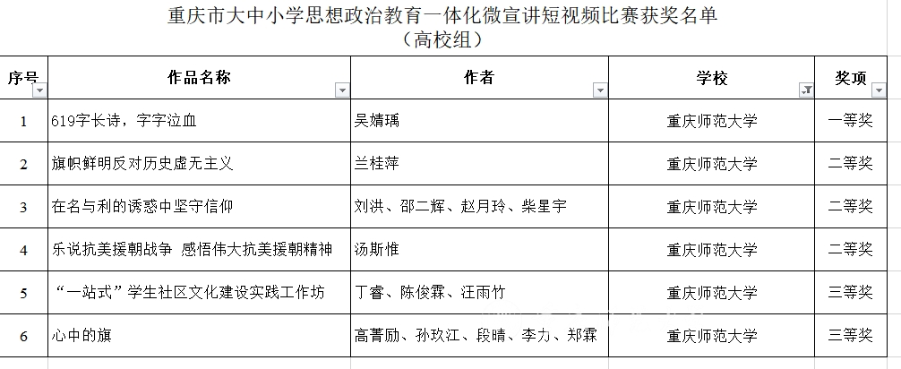 近日,重庆市教委公布重庆市大中小学思想政治教育一体化微宣讲短视频比赛获奖名单。米乐官网参赛师生斩获高校组一等奖1项,二等奖3项,三等奖2项,获奖数量位居全市参赛院校前列,学校荣获优秀组织奖。