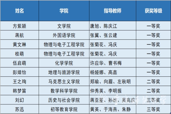 本次竞赛米乐官网11名选手参加全部组别竞赛,9人进入决赛。文学院方紫颖,外国语学院蒋航,物理与电子工程学院黄文琳、桂萌,化学学院伍启萌,地理与旅游学院彭婧怡获一等奖;马克思主义学院王之珣、数学科学学院韩梦笛获二等奖;历史与社会学院刘幻、初等教育学院苏迅获三等奖。