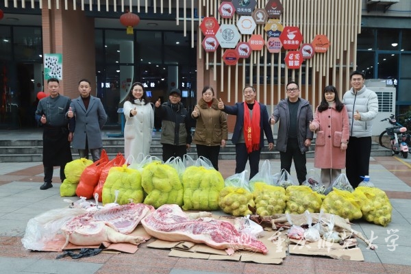 猪肉、土豆、鸡肉、绿豆……一摞摞农产品被堆放在米乐官网大学城校区一食堂门口。1月4日,綦江区石壕镇万隆村村民带着一车农产品来到学校,为学校师生送上冬日温暖。