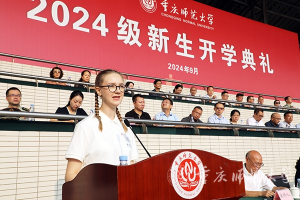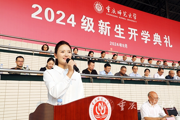 本科新生代表、文学院2024级戏剧影视文学专业马菲娅同学在发言中表达了成为重师人的自豪与幸福。她谈到,许多优秀的学姐学长们谨遵“要在社会的广阔天地大显身手”的殷殷嘱托,走进藏东秘境,扎根边疆,投身强国建设。如今,接力棒传递到了新生的手中,他们将学姐学长为榜样,立大志,勤实践,用脚步丈量祖国的土地,用双手触摸理想的蓝天,用行动践行习近平总书记的教诲,让努力为时光所见,在奋斗岁月里绽放绚烂花朵,在拼搏旅途中点亮梦想星光。
