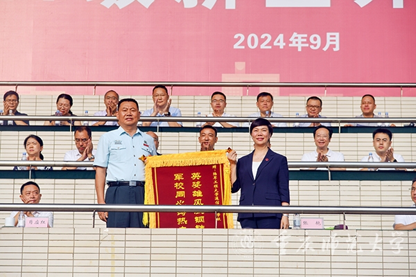学校党委书记张艳代表学校向承训部队赠送锦旗,对承训教官在军训期间的辛勤付出表示感谢。