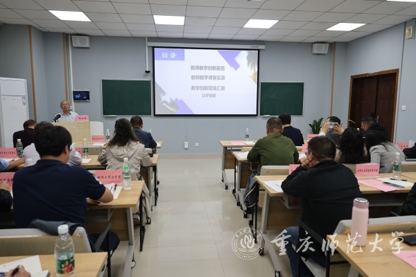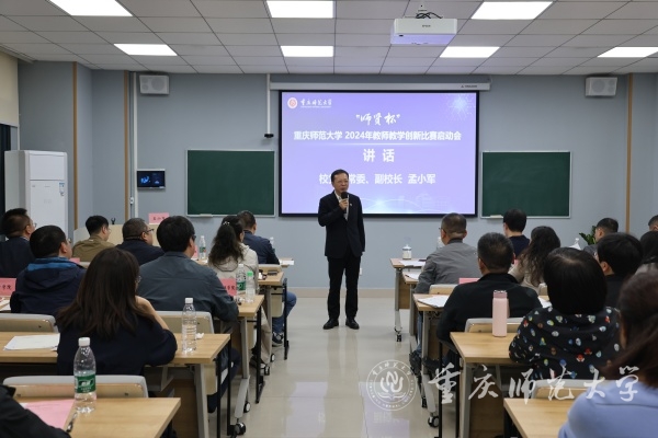 孟小军在讲话中指出,教师教学创新大赛不仅是教师个人能力的展示平台,更是推动学校教育改革、提升教学质量的重要途径。一是要强化教师教育特色,坚守师范教育主阵地,以教师教学能力与创新能力的提升赋能师范生教育教学技能和综合素养的提高,为学校的人才培养质量打下坚实基础。二是各学院要秉持“以赛促教、以赛促改”的理念,以比赛为契机多维度、深层次提升教师教育教学能力。三是要强化支持体系,各学院需转变观念,加大投入,集中优势资源促教学。希望参赛教师能够以本次比赛为契机,踔厉奋发、突出重围,力争今年能够代表重庆,在国赛中展现重师教师风采,推动学校教学质量再上新台阶。