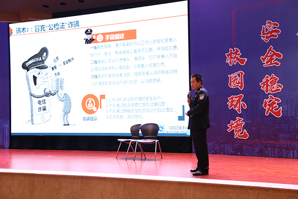 为了让同学们深刻认识黑恶势力的危害,来自重庆市反诈骗中心的警官张宇带来了一场关于扫黑除恶校园行电信诈骗及校园贷防范宣讲。他通过经典案件的讲述,总结诈骗的特点趋势,罗列出冒充虚拟身份诈骗、网评刷单诈骗、发送木马链接诈骗等多种诈骗方式,并结合实际应用给出应对措施。米乐官网新闻中心的同学针对此次活动,配合张警官的讲解将诈骗案例改编成情景剧,让现场师生对诈骗手段有了更全面、更深刻的认识。