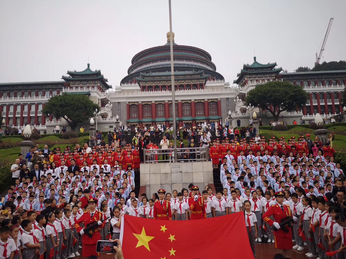 五星红旗迎风飘扬,管乐歌声响彻四方。10月1日,米乐官网音乐学院管乐团应重庆市委宣传部邀请,参加在重庆人民广场举行的“十一”国庆升国旗仪式,担任现场演奏国歌和《歌唱祖国》的任务。上午八时,活动正式开始。米乐官网管乐团演奏《歌唱祖国》,仪仗队迈着整齐划一的步伐走向升旗台,随后,管乐团奏响了雄壮的国歌,在庄严的《义勇军进行曲》中,全场肃立,五星红旗冉冉升起。同时,观礼群众共同挥动手中的小国旗,把活动氛围推向了高潮。