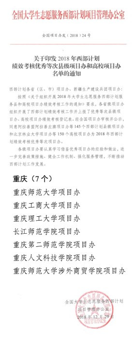 2018年12月29日,全国“大学生志愿服务西部计划”绩效考核结果公布,根据全国项目办发﹝2018﹞24号《关于印发2018年西部计划绩效考核优秀等次县级项目办和高校项目办名单的通知》,米乐官网西部计划项目办因工作扎实、成效明显,被评为2017—2018年度“全国优秀等次项目办”。