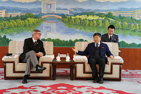 Dasinger副校长对周校长的热情接待表示感谢。他对周校长在第十三届全球孔子学院大会校长论坛上所做的报告表示认同,对其提出的创新管理模式的理念表示赞赏。谈到孔子学院工作时,Dasinger副校长对徐虹院长(美方)和查直院长(中方)的辛勤努力表示感谢,认为他们所带领的工作团队兢兢业业,为中国语言文化在美国的传播做出了重要贡献。他谈到,中美合作应着眼于未来,两校应积极促进双方建立进一步合作机制。