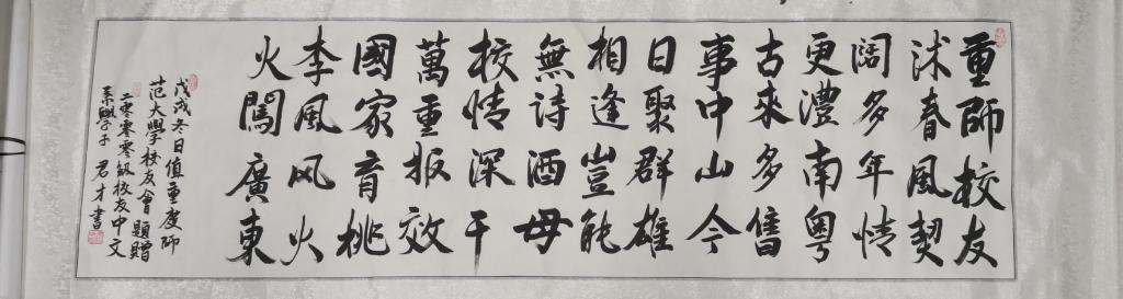 会上,英语92级校友,东莞石龙中学高中英语备课组长王世建分享了自己从一名普通教师成长为名师的奋斗历程。中文2000级校友,广州四中教师、作家、诗人余君才向校友总会赠送了书法作品。参加会议的其他在广东的校友代表也纷纷热情发言。在汇报了取得成绩的同时,也衷心对母校的辛勤培养表达了感谢,对母校与校友之间的交流表达了期盼,对母校今后的发展表达了祝福。