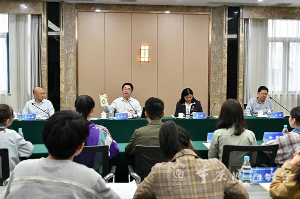 随后,各学院学生代表自由发言。物理与电子工程学院2015级少数民族学生代表阿拉努汗·吾休尔汇报了自己大学四年的学习生活情况,并积极向党组织靠拢。美术学院2017级服装与服饰设计专业学生贾立斌分享了自己的创业学习收获,他提议学校可以建立学习资源共享平台,实施点对点培训。计算机与信息科学学院2016级计算机科学与技术专业学生肖敬就社团活动专业性不强、质量欠佳的问题提出建议,化学学院2017级化学专业学生李晨曦提议学校可以建立师生线上交流平台,初等教育学院2018级小学教育全科黄俐嘉代表北碚校区同学感谢领导老师们对北碚校区的关心,并就小学全科教师文理分科的情况提出了建议。座谈会气氛热烈而和谐,26名来自不同学院不同专业的学生代表从学校的硬件设备、分流管理、教学模式、课程设置、招生就业、学术活动、教学资源等多个方面发表看法,提出建议。