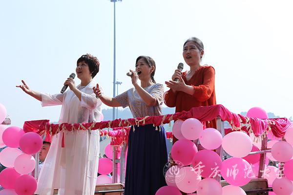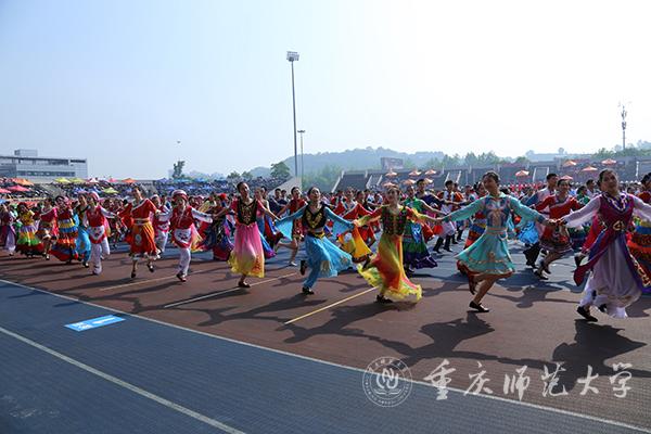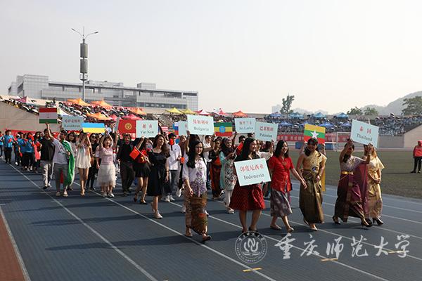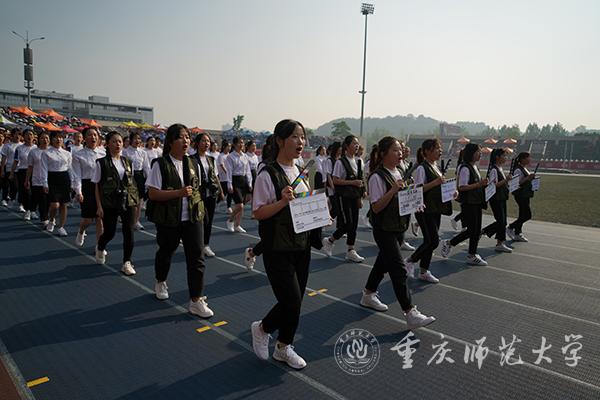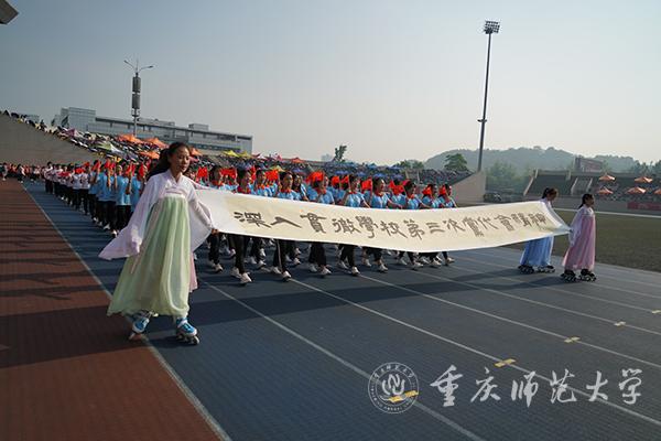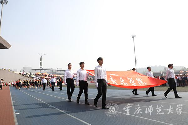 运动场内气氛热烈,鼓乐喧天。鼓舞人心的标语——“为加快建设教师教育特色鲜明的高水平综合性师范大学而努力奋斗”“青年兴则国家兴青年强则国家强”“志存高远脚踏实地勇做时代的弄潮儿”尽收眼底,尽入胸怀。现场奏响节奏鲜明的《运动员进行曲》,朝气蓬勃的会旗队员拥护着国旗、校旗、“不忘初心、牢记使命”“同心同力戮力奋进”宣誓牌,昂首阔步走向主席台。