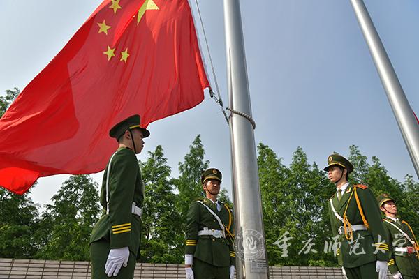 在雄壮的国歌声中,五星红旗冉冉升起,迎风飘扬。全场肃立,面向国旗行注视礼。