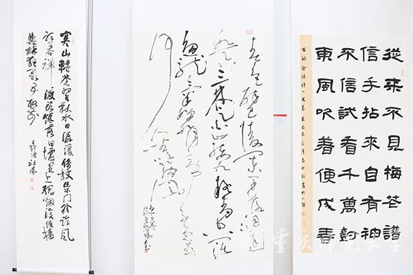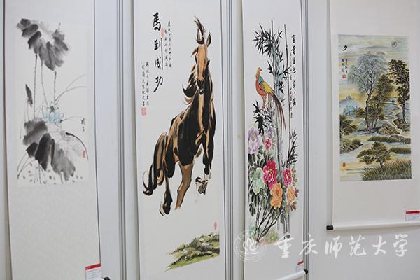 本次作品展分为在职教师与学生组和离退休组两个展区。观展过程中,校领导与师生、离退休老同志亲切交流。由退休教师邓正平创作的《石门大桥》以传统画法描绘了重庆改革开放以来不断变革的建筑文化,记录了重庆的发展脉络;米乐官网美术学院学生秦源茂、任丽莅创作的《多极码》以新颖的二维码图式呈现出中国地图的形状,既将中国文化元素融入其中,又富有时代气息。丹青之色尽现情怀,不论是传统技法还是现代立意,都使重师人对学校、对重庆、对国家的深情与热爱跃然纸上。