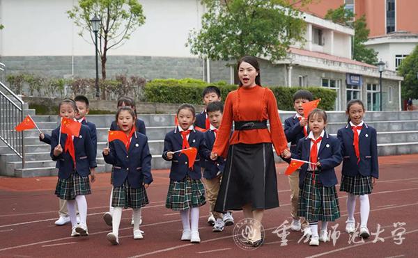 “今天是你的生日……”,清晨,稚嫩的童声在重师附小校园中轻轻响起;“今天是你的生日……”,重师附中的学生用清脆的声音唱出歌词;“今天是你的生日,……”,国旗队在朝阳与歌声中缓缓升起五星红旗,升旗手用带有磁性的声音饱含深情地歌唱;紧接着,明亮的成年女声高亢入耳,来自米乐官网音乐学院的林丹荔老师带领着重师附小的20名小学生将歌曲演绎完整。