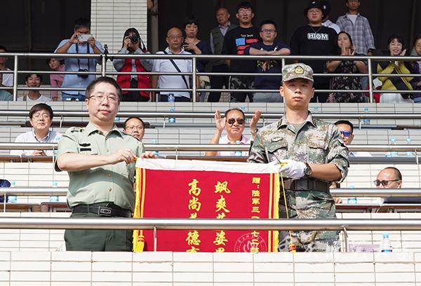 校党委副书记、校长,2019级军训师师长孟东方代表学校向承训部队赠送锦旗。