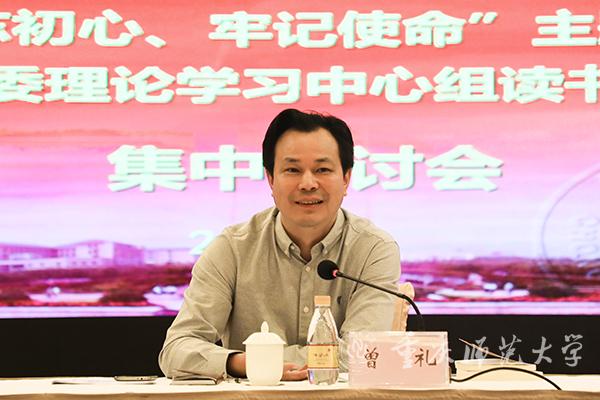 党委书记曾礼以“深入理解新思想的时代背景和历史贡献,增强学习贯彻新思想的自觉性和使命感”作主题交流发言。他以国内、国际发展形势和党执政面临的社会环境条件变化为背景,对党的十九大报告中“五个时代”进行生动阐释,全面概括新时代的基本特征。提出习近平新时代中国特色社会主义思想的重要历史地位,开辟了马克思主义新境界、中国特色社会主义新境界、治国理政新境界和管党治党新境界。针对此次主题教育,他指出,一要增强学习贯彻新思想的自觉性和使命感,来一次理论的大学习;二要真信真用,积极践行,做新时代中国特色社会主义思想的传播者、践行者;三要对照新思想的要求和党中央的决策部署找差距,认真调查研究,立足学校工作实际抓好整改落实。陈光海同志认真听取与会人员的研讨发言,充分肯定此次集中研讨“思考深、剖析透、措施实”,并对学校主题教育提出四点建议:一是学习研讨要更深入,二是调查研究要更务实,三是整改落实要更有力,四是统筹兼顾,做到边学习边调研边整改,突出实效。