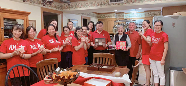 另悉,9月15日,孔子学院大家庭成员齐聚特洛伊大学原副校长Ingram 博士家,欢庆中秋佳节。Ingram 博士及夫人为庆祝中国传统节日精心布置了以“中国红”为主题的餐桌,老师们带来了富有家乡特色的中餐,与Ingram夫妇一起品尝月饼,共度佳节。