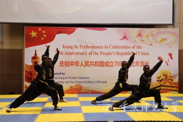 当地时间9月15日晚,庆祝中华人民共和国成立70周年武术汇演在卢旺达首都基加利国际会展中心举行。卢政府及社会各界、驻卢使节、中资机构和华侨华人代表、卢旺达大学教育学院孔子学院师生等500余人观看演出。