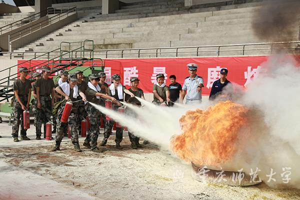随后,消防中队官兵邀请学生代表现场学习正确使用灭火器等消防救援工具,并在消防官兵及学校保卫处老师的安全指导下,按照灭火的正确步骤和方法,亲自体验了现场灭火的过程,将燃起浓烟的大火成功迅速扑灭,新生在整个灭火过程沉着、冷静、迅速、有效。