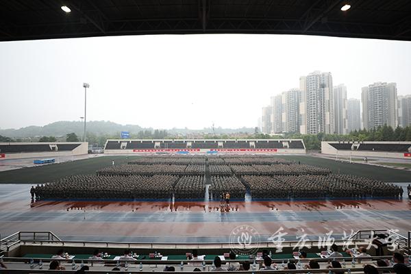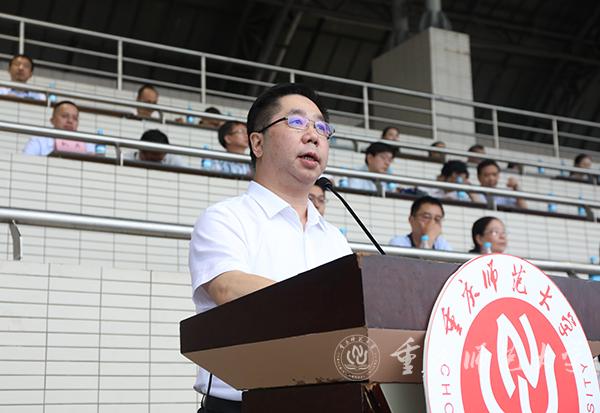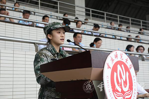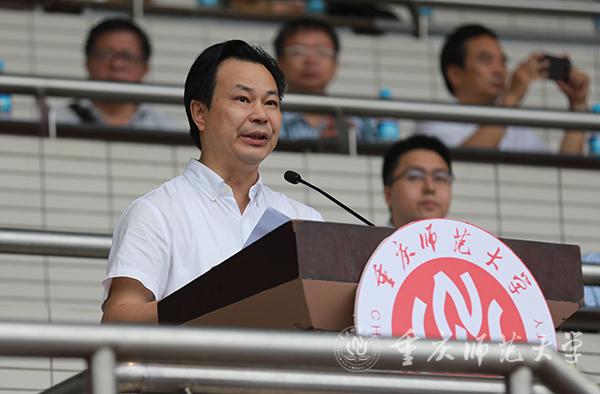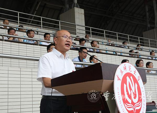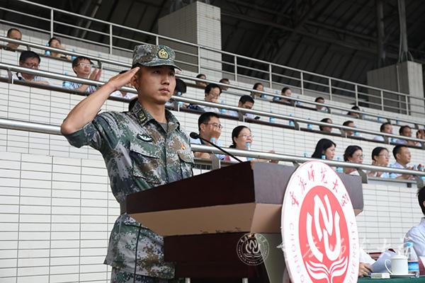 校党委副书记、校长、2019级新生军训师师长孟东方讲话,并宣布2019级新生军训开训令。他以“成才:在走进重师与走出重师之间”为题开启了新生入学第一课,并与同学们分享了三句话。