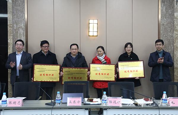 座谈会伊始,校领导为27名论文获奖者颁授了荣誉证书,为马克思主义学院党委、文学院党委、离退休党委等8个二级党组织颁授了“优秀组织奖”奖牌。