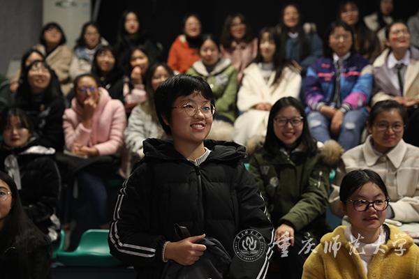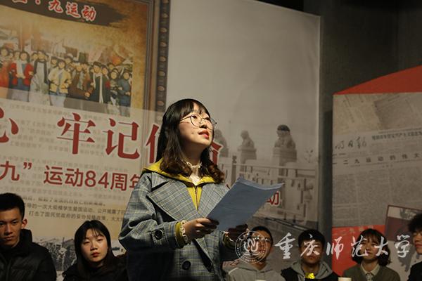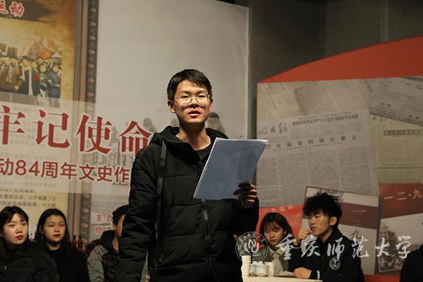 “起来!起来!……在中国只要有青年,就有希冀!”新闻中心成员司书鑫、王茜共同带来朗诵《纪念“一二·九”》,以诗歌缅怀苦难的时日;《红岩春秋》之友社社长林佳手捧《毛泽东选集》,为大家讲述第二卷《青年运动的方向》,经典的文字穿越历史的时空,毛泽东对青年人的期望犹在耳畔;在歌曲《江山》的旋律中,中特协会代表吴侬倚朗读《习近平总书记对青年的寄语》,寄语当代青年应树立远大理想、弘扬社会主义核心价值观与爱国情怀。新闻中心成员还带来《铭记》《青春中国》《献给祖国母亲的歌》等朗诵节目,激发了同学们的爱国热情,同学在聆听中产生了强烈的情感共鸣。