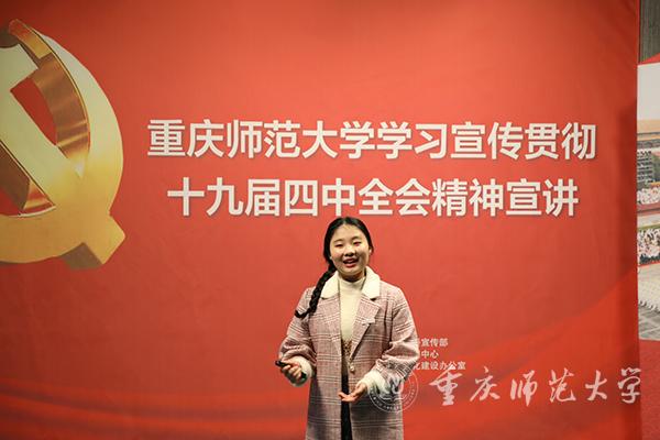 马克思主义学院思想政治教育专业的学生结合国情,引用大量鲜活的史料、事例和数据,声情并茂地对十九届四中全会精神进行了精确阐释。“奇迹,就是将不可能创造出可能。”《说说两个奇迹》凸显出新中国成立70年来,我们党领导人民创造了世所罕见的“经济快速发展”和“社会长期稳定”两大奇迹;《我看文化自信》宣讲掀起了现场的一阵热潮,台下的观众与台上的宣讲人产生强烈的共鸣“中国人民应该有这个信心,每一个中国人都应该有这个信心!”;《联林珍奇》的五组成员在《渔舟唱晚》的古筝伴奏中,吟诵数字联、回文联等30条对联,将对联的对仗美、字形美、音韵美与意蕴美体现得淋漓尽致;《我们是社会主义的建设者和接班人》则清晰地阐述了党的教育方针的历史演进,“德智体美劳”五育并举全面发展的新时代教育方针。宣讲人最后与大家共勉,努力成长为“志存高远,脚踏实地”的新时代有为青年、“德才兼备、知行合一”的高素质人才、德智体美劳全面发展的社会主义建设者和接班人。