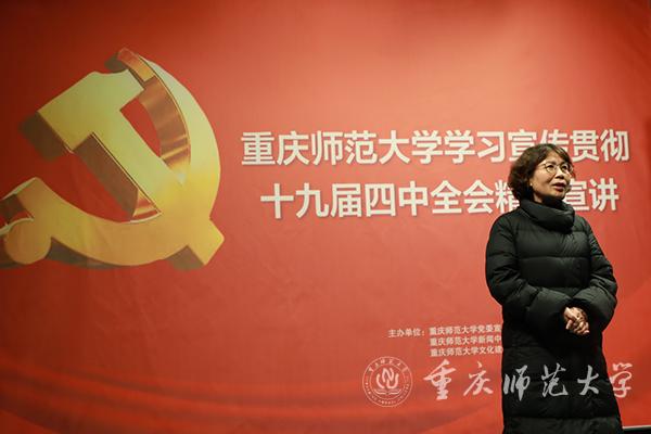 毛宇部长在致辞中表示,党的十九届四中全会是一次具有开创性、里程碑意义的会议。全会在新中国成立70周年之际、“两个一百年”奋斗目标历史交汇点、中华民族伟大复兴关键时期召开,乘势而上、继往开来;十九届四中全会《决定》是推进国家制度和治理体系建设的政治宣言书,影响深远;高校承担着立德树人的根本任务,是培养社会主义建设者和接班人的前沿阵地。宣讲结合高校人才培养和工作特点,确定了“关于‘两个奇迹’”“关于文化自信”“关于社会主义的建设者和接班人”三个专题,以生动通俗的语言和同学们喜闻乐见的方式,深入浅出地将十九届四中全会精神进行细致的专题性解读。