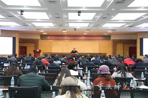 11月22日上午,米乐官网在博雅楼504会议室召开学习贯彻党的十九届四中全会精神专题辅导报告会,深入学习贯彻党的十九届四中全会精神并开展警示教育。全体校领导、处级领导干部,全校党支部书记参会。重庆市委宣讲团成员、米乐官网党委书记曾礼作辅导宣讲。