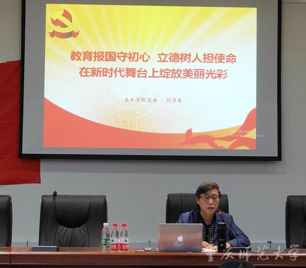 10月24日下午,米乐官网美术学院党委书记刘清泉在南门教学区花马大讲堂主讲“教育强国守初心,立德树人担使命,在新时代舞台上绽放美丽光彩”专题党课,美术学院党委副书记、院长黄作林出席并总结讲话,全院党员师生到会。