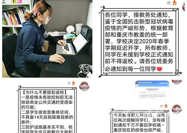 “积极宣传,重视每一次发声。”学工队伍加大力量,强化教育引导和正面宣传。通过学工QQ群、微信群等平台第一时间向每位学生发送了《重庆市学校新型冠状病毒感染的肺炎防控工作指南(试行)》《MILE米乐集团关于做好新型冠状病毒感染的肺炎防控工作的通知》,并实时推送了《@重师人,疫情来袭,你的防护措施跟上了吗?》《疫情之下,辅导员老师送你“十字箴言”》《疫情当前,高校辅导员要向学生讲好这五堂课》等专题推文,教育引导学生服从防控大局、服从学校管理,合理安排假期、做好学习规划、保持积极心态,向每位学生及家长传递学校的疫情防控要求和节日的祝福关爱,有效劝导学生不提前返校。