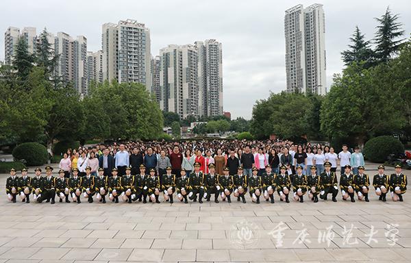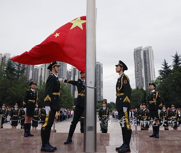 上午7:45分,化学学院师生在雨中列队完毕。学校国旗护卫队队员迈着整齐的步伐护送国旗走向升旗台。当学校国旗护卫队迈着整齐的步伐护送国旗走向升旗台时,升旗仪式正式开始。《义勇军进行曲》时隔半年再次在重师校园奏响,全体师生肃立,向鲜艳的五星红旗行注目礼,看着冉冉升起的五星红旗,每个人的眼里都闪着熠熠光芒。
