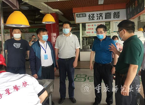 5月11日下午,第一批学生返校前一天,校党委书记曾礼带队检查指导学生返校复课各项工作,副校长杨如安,党政办、学生处、研究生院、后勤保障处、保卫处负责人陪同检查。曾书记一行先后检查了北侧门门禁管理、弘德楼教室消杀、和风苑学生宿舍消毒、学生一食堂准备等情况,对各部门、各岗位落实防疫工作责任、加强管理作了指导。曾书记一行来到文学院与数学科学学院,听取了学院负责人学生返校复课准备情况汇报,并对学院落实主体责任、做好开学复课工作、稳妥安排好开学后各项工作提出工作要求。