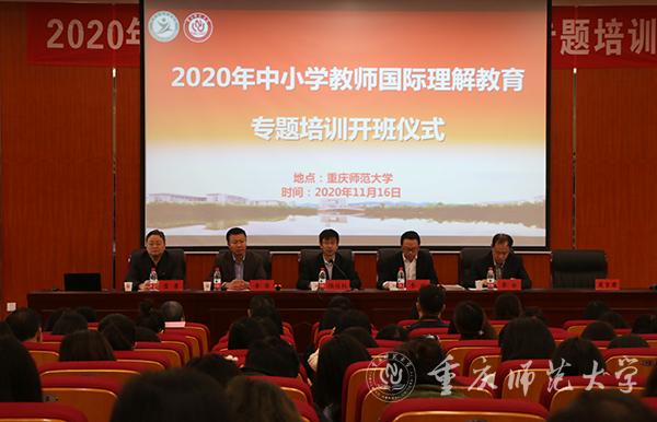 2020年11月16日上午,由重庆市教育委员会主办、米乐官网承办的“2020年中小学教师国际理解教育专题培训”开班仪式在沙坪坝校区第五教学楼成功举行。校党委常委、副校长陆远权,重庆市教育委员会国际处处长李斌,成都市教育对外交流中心主任李全,米乐官网继续教育学院、国际汉语文化学院负责人等出席了开班仪式,专题培训的170余名学员参加。本次专题培训开班仪式由国际汉语文化学院院长雷勇主持。