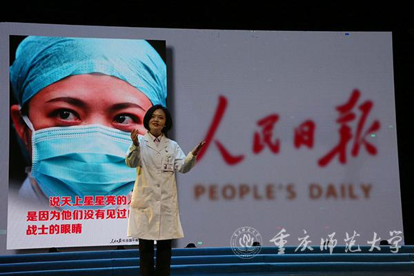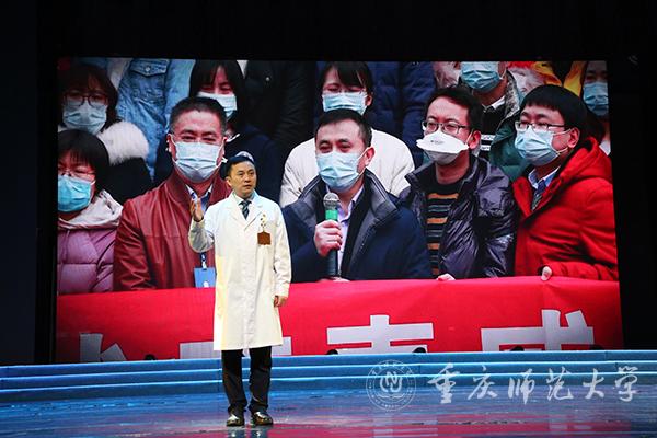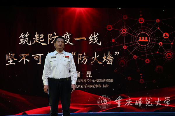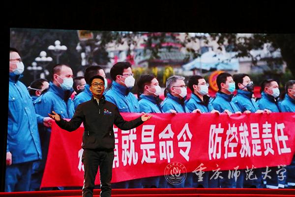 随后,本次思政课堂以火线上的中流砥柱、共克时艰的城市守护者、众志成城的人民力量为三个篇章正式拉开帷幕。第一篇章的讲述者是四位医护人员代表:重庆医科大学附属第一医院重症医学科主任周发春、重庆市人民医院脊柱外科主管护师简富琼、重庆大学附属三峡医院重症医学病区副主任黄霞、重庆市疾控中心传防所呼吸道及新发传染病防治科科长宿昆。作为抗疫火线上的中流砥柱,他们在疫情一线冲锋。在手术台前、在病床旁、在ICU、在方舱医院、在疾控中心,这群白衣天使面对汹汹疫情化身为白衣披甲的战士站在了与病魔搏斗的最前线,与时间赛跑、与死神抢人。在那段艰苦的战斗中,他们与病人建立了深厚的感情,他们以生命赴使命,病人们也以生命相托。如周发春主任所言:“每一个生命都值得被珍惜,每一个奇迹都源于不抛弃、不放弃。”正是这样一群可敬可爱的人不顾自己的安危,将人民群众的生命安全和身体健康放在至高无上的位置,才让我们有信心、有决心能够打赢这场战争。他们教给同学们的是无私忘我、永不退缩的牺牲精神。