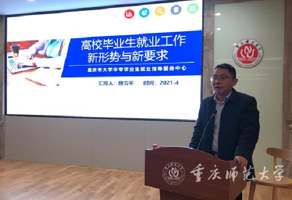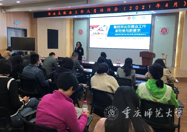 本次培训邀请了重庆市大学中专毕业生就业指导中心副主任唐雪平到校,作题为“高校毕业生就业工作新形势与新要求”的专题辅导报告。唐副主任首先介绍了2021年以来全国和重庆市就业工作面临的新形势,重点介绍了党中央、国务院对基层就业工作提出的“坚持以人民为中心”的新要求。他对重庆市目前应届毕业生的就业状况、毕业去向和当下就业工作所面临的困难进行了深入的剖析,指出2021年因政策性岗位增幅有限,外贸、旅游等行业岗位需求减少,互联网、教育行业的需求向高端人才倾斜,普通师范类高校应届毕业生将继续面临更大的挑战。他建议学校要强化精准就业指导服务,开发面向应届毕业生的行政助理见习岗位,鼓励毕业生参军入伍,引导毕业生自主创业,加大对困难群体的帮扶力度,用积极行动缓解毕业生“慢就业”的趋势。唐副主任还建议各级就业人员要加强研究分析,总结新形势下的规律,主动出击开展市场开拓,加强各类双选会组织动员,引导毕业生去往市场需求更大的非公有制单位,更好地服务地方经济发展。