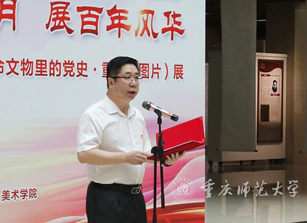 开幕式上,孟东方校长讲话。他指出,本次“双展”活动的举办意义重大、内涵丰富,具有鲜明的重师特色。展览活动通过党史图片和美术作品,生动地呈现了中国共产党领导中国从星火燎原到走向辉煌的伟大历程,再现了中国人民争取民族独立、实现国家富强、走上幸福生活的光辉道路。孟校长希望师生们通过观看本次展览,滋养心灵、提升境界,在重温重庆革命故事、品位欣赏艺术作品的过程中,赓续共产党人的精神血脉,重温初心使命,为实现中华民族伟大复兴的中国梦而不懈奋斗。