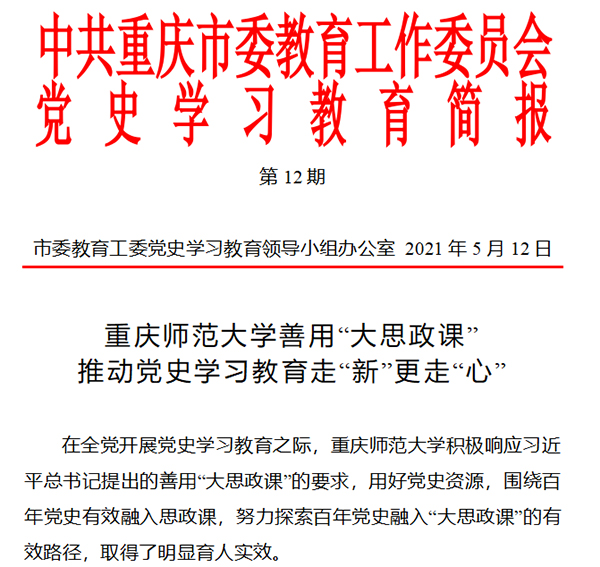 截至目前,学校党史学习教育经验做法在重庆市党史学习教育领导小组简报中被提及10次,《MILE米乐集团善用“大思政课” 推动党史学习教育走“新”更走“心”》被重庆市委教育工委以专报形式发布。学校开展党史学习教育特色亮点举措受到主流媒体广泛关注,人民网、新华网、《光明日报》《重庆日报》等报道20余篇次。学校党委书记曾礼参加全市党史学习教育领导小组办公室负责同志座谈会并做交流发言。