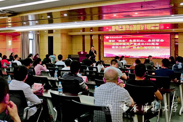 为深入学习贯彻习近平新时代中国特色社会主义思想,特别是习近平总书记关于党史、新中国史、改革开放史、社会主义发展史的重要论述,隆重纪念党的百年华诞,增强学习实效,6月10日,校工会在博雅楼503会议室举办教职工学习“四史”知识竞赛,22个二级工会派代表参加了竞赛。