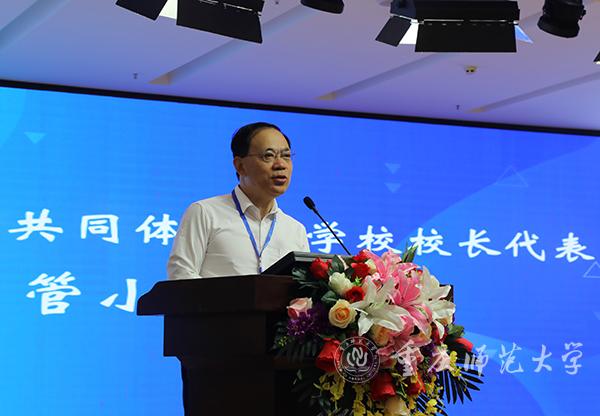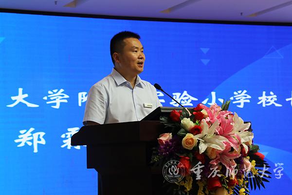 随后,重师附小校长郑霖致欢迎辞。他介绍了重师附小“因生而动,顺性扬才”的办学理念、“顺性教育”的实践路径等基本情况。他表示,重师附小作为一所依托于师范大学、服务于小学教育的实验学校,充分发挥“大学里的小学”的优势,整合师大成熟的师范教育学科体系,整合大学城高校云集的教育资源优势,依托“24N”课程体系,通过语言、数理、艺体、实践四大课群综合发展,全面提高学生的科学素养与人文修养,促进学生多元化发展。后续,成都及重庆四所共同体学校的语文学科教育教学将实现校际交流、智慧碰撞,唱响川渝双城教育“双城记”,互动,教研和共生。