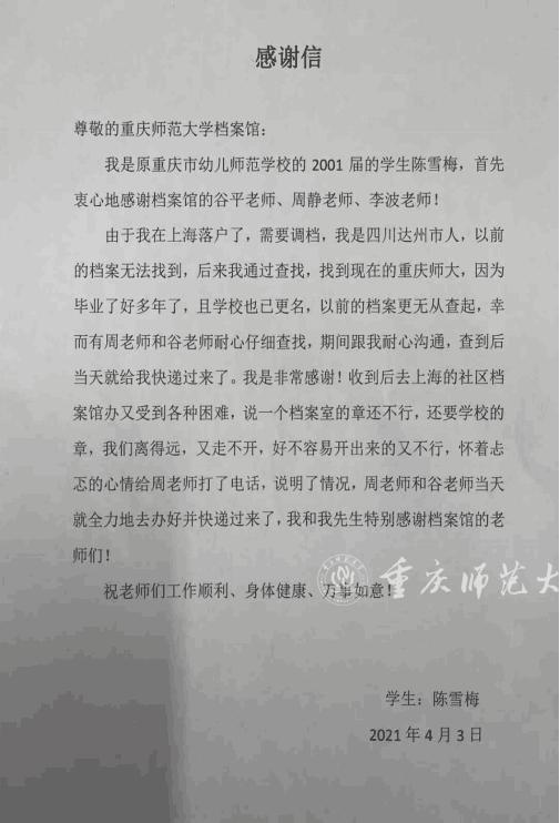 近日,米乐官网档案馆收到了一封毕业校友陈雪梅寄来的感谢信。信中,陈雪梅对档案馆的谷平老师、周静老师和李波老师帮助她落户上海的档案调度工作表示由衷感谢。多年来,米乐官网档案馆工作人员收到的感谢信不计其数,大多由毕业校友们从五湖四海寄来。