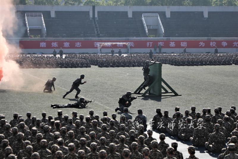 魏涛大校一行深入到新生军训现场,观看了内容为“战斗班执行搜索歼灭任务”相关行动的训练展示。在展示中,战斗班在训练时突然接到上级命令,组织紧急集合,立即前往任务区域执行任务。在烟雾弥漫的任务区,战斗班的教官们时而匍匐前进,时而随着号角声奔跑向前,成功完成了穿越火圈、跨越火墙、单人飞跃铁丝网,双人协助通过铁丝网、搬运救护受伤队员等一系列展示动作。
