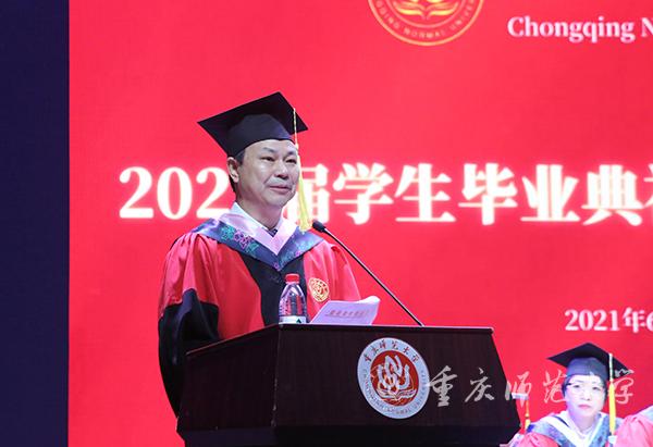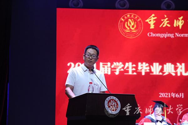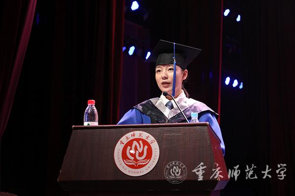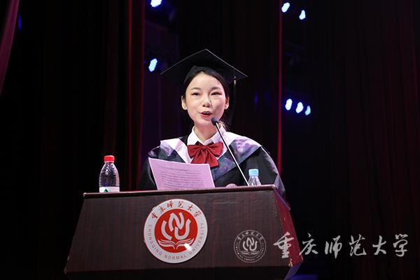 “一朝重师人,一生重师魂。”来自马克思主义学院思想政治教育专业的本科生代表王小桥在典礼上发言。她回忆了自己与重师相知相遇的四年,感谢母校的悉心培养,感恩老师的谆谆教诲。她表示,今年的毕业季恰逢中国共产党成立100周年,我们这一代年轻人与伟大的时代同向同行,是实现第二个百年奋斗目标的建设者、见证者,必将带着“重师人”的印记跟续奋进,追求卓越,不负学校重托!