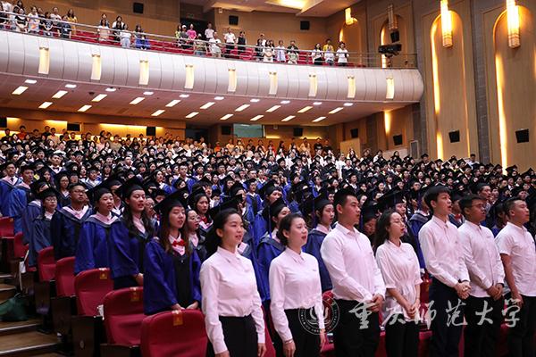 “我们重庆师大,厚德笃学,理肃文昌……我们重庆师大,励志创新,日灿月华……”毕业生们唱响了校歌,为自己四年的重师岁月画上了圆满的句号。