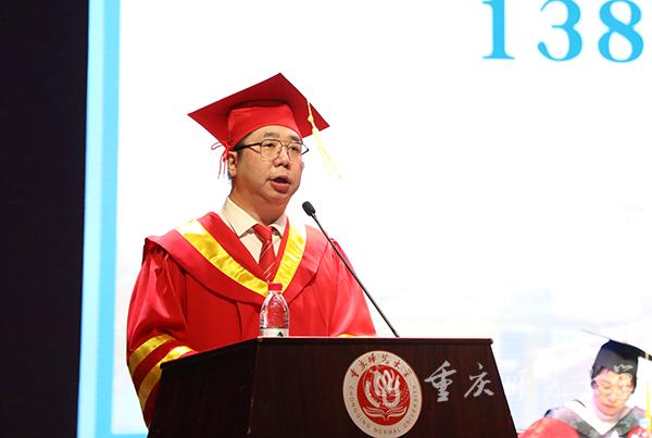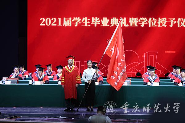 庄严肃穆的中华人民共和国国歌奏唱完毕后,校党委书记曾礼教授宣读《重庆市优秀毕业生表彰决定》。仪式上,校领导为2021届毕业生校友分会常务理事颁发聘书,校长孟东方教授为2021届毕业生校友分会授旗。