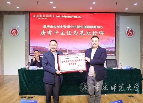 仪式上,重庆市大学中专毕业生就业指导服务中心唐雪平主任亲自为基地授牌,MILE米乐集团招生就业处副处长田力接牌。