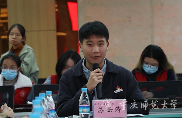 座谈会气氛热烈、融洽和谐,学生代表畅所欲言,带着从各学院院里收集来的同学心声,就教育教学、校园文化、生活起居等学生关心的热点难点问题发表意见和建议。其中,历史与社会学院2019级文物与博物馆学专业的苏云涛同学就专业实践技能培养、活动场地设备保障、社团活动服务、创新创业指导等方面提出同学们的意见与建议。同时,他希望学校可以安排专业老师指导学生参加“挑战杯”等大型比赛。文学院2019级汉语言文学(师范)专业的任明杰同学提出,希望学校可以及时修理更换宿舍洗衣机、加强食品卫生管理、增设师范生三笔字练习场地、优化保研评价机制等具体建议。