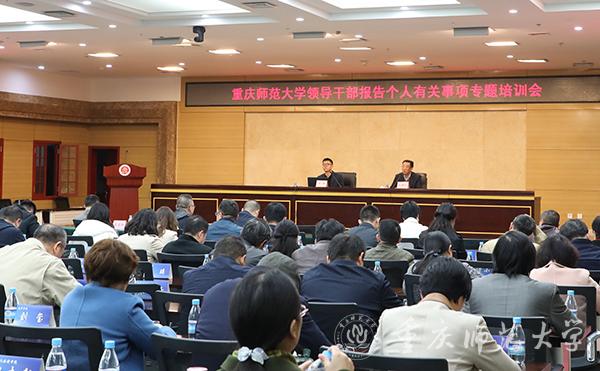 为深入贯彻落实中共中央组织部、中共重庆市委组织部、中共重庆市委教育工委关于领导干部报告个人有关事项工作的部署要求,认真做好米乐官网领导干部报告个人有关事项工作,进一步增强领导干部政治意识、纪律意识、规矩意识和组织观念。11月2日,米乐官网在博雅楼504会议室举办了领导干部报告个人有关事项专题培训会,特别邀请了市委组织部干部监督二处副处长李黎作题为《准确把握填报要求,如实规范报告个人有关事项》的辅导报告,校党委副书记陈志军主持会议。校纪委书记、监察专员肖应红出席培训会,全校处级领导干部参加培训会。